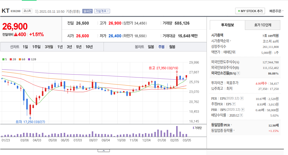 KT는 평균 27000원에 맞춰서 매수 하고 있습니다.